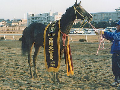 見事、高崎大賞典を制覇した時の写真です。 この時は、一ファンとして、スタンドから撮影しました。 それでもこういう「ファンサービス」をしてくれたり、ちゃちな撮影機材でも、これだけのものが撮影できるのが、地方競馬の魅力の一つだと思うのですが、いかがでしょうか? 余談ですが、数えてみたら、’02年最も私の被写体になった競走馬は、何を隠そうこの馬です。(’02.12.31撮影) |