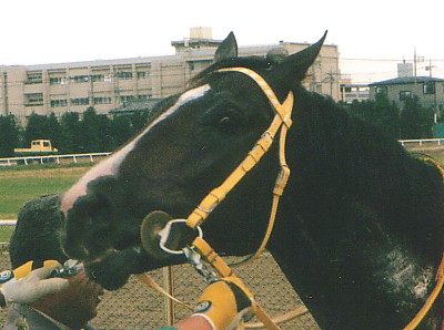 で、これが、約7ヶ月後、かなりデカい顔して検量室前をウロつくようになってからの写真。 しかし、我ながら、ムチャなことしてますなあ……。 微妙に傾いているのは、ご愛嬌で……(苦笑) それ以上に、北関東の調教師の先生方には、本当にご迷惑をおかけしております。(’03.10.12撮影) |